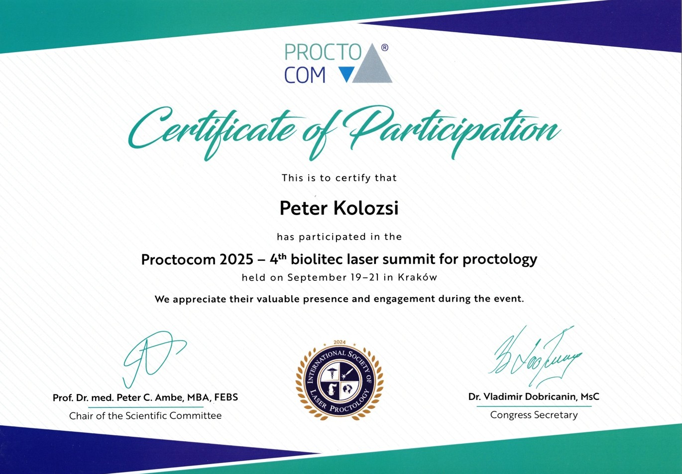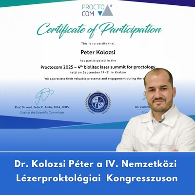 Klinikánk kiváló szakorvosa, Dr. Kolozsi Péter részt vett a IV. Nemzetközi Lézerproktológiai Kongresszuson (Proctocom 2025), amelyet 2025. szeptember 19–21. között rendeztek meg Krakkóban, Lengyelországban